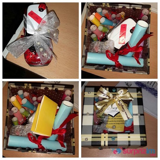 Arabayı dilediğiniz gibi süsleyin hatta plaka bile yapın ben çıkma tarihimiz yaptım 🙂 Arabayı kutuya yerleştirdim ve elişi kağıtlarını dilediğim boyutlarda keserek beyaz taraflarına dilediğimi yazdım ve tam arabanın üstüne bir mektup yazıp koydum içimden geçenleri yazdım sonuna şimdilik oyuncağını alabildim ama inşallah ilerde beraber gerçeğini alabiliriz yazdım. Erkek arkadaşıma 6. ayımızda verdim ve inanılmaz mutlu olmuştu…